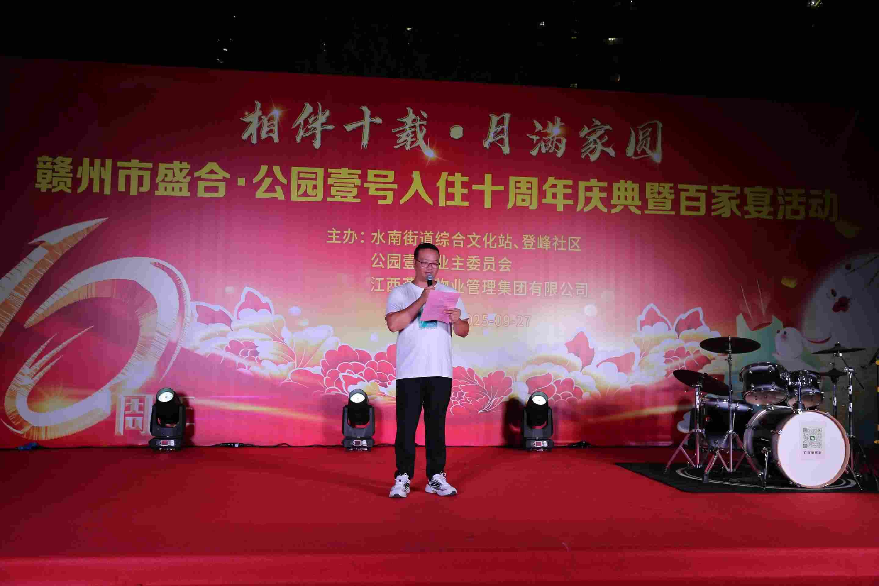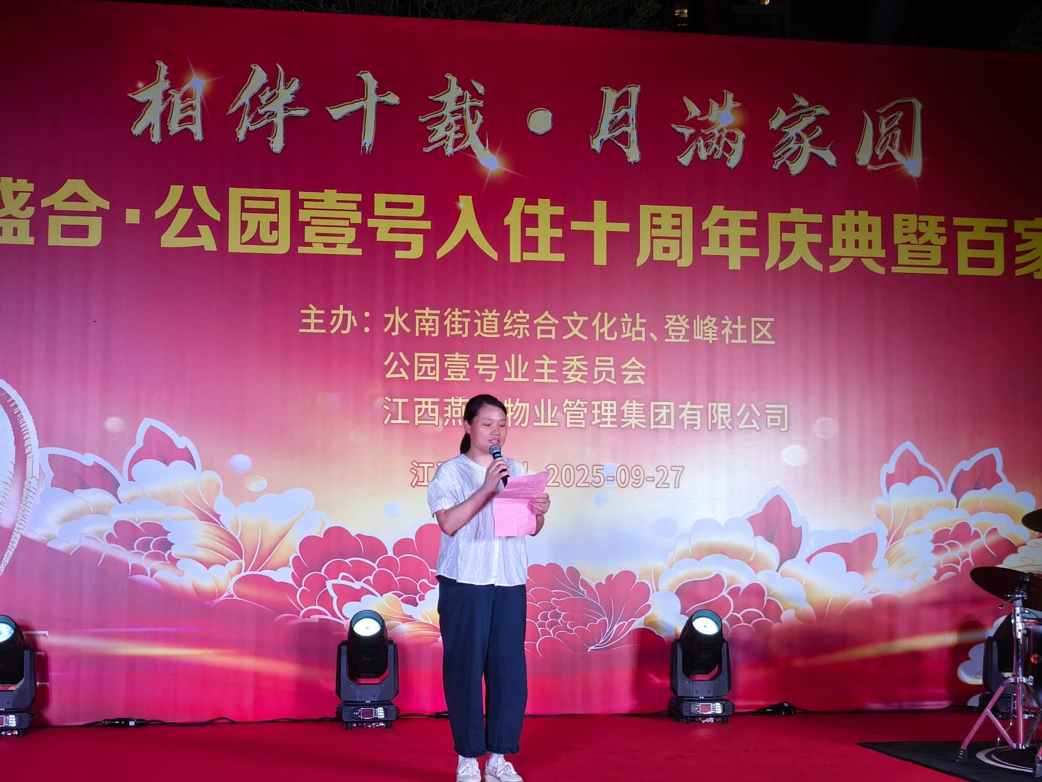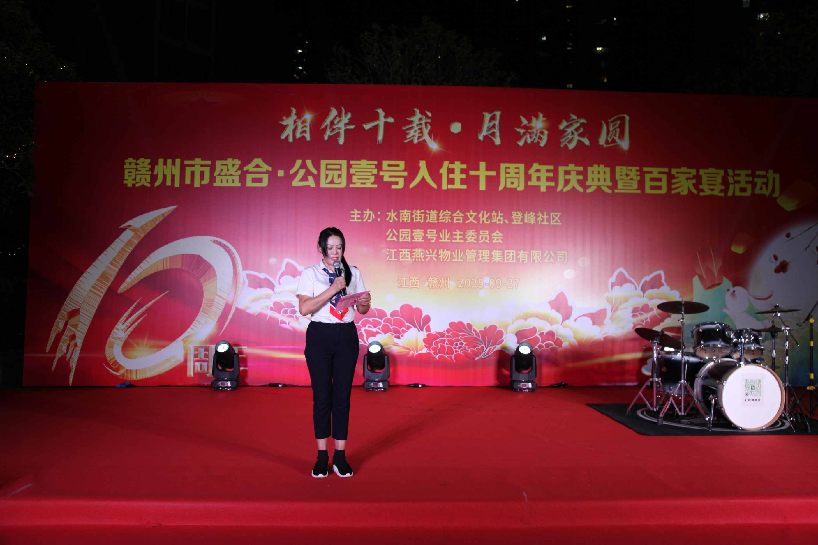 金秋送爽,丹桂飄香。9月27日晚,章貢區(qū)水南街道登峰社區(qū)盛合·公園壹號小區(qū)張燈結彩、歡聲笑語,一場以“相伴十載·月滿家圓”為主題的業(yè)主入住十周年慶典暨百家宴活動溫馨上演,燕興物業(yè)集團代表和數(shù)百名業(yè)主代表歡聚一堂,共敘十年鄰里深情。